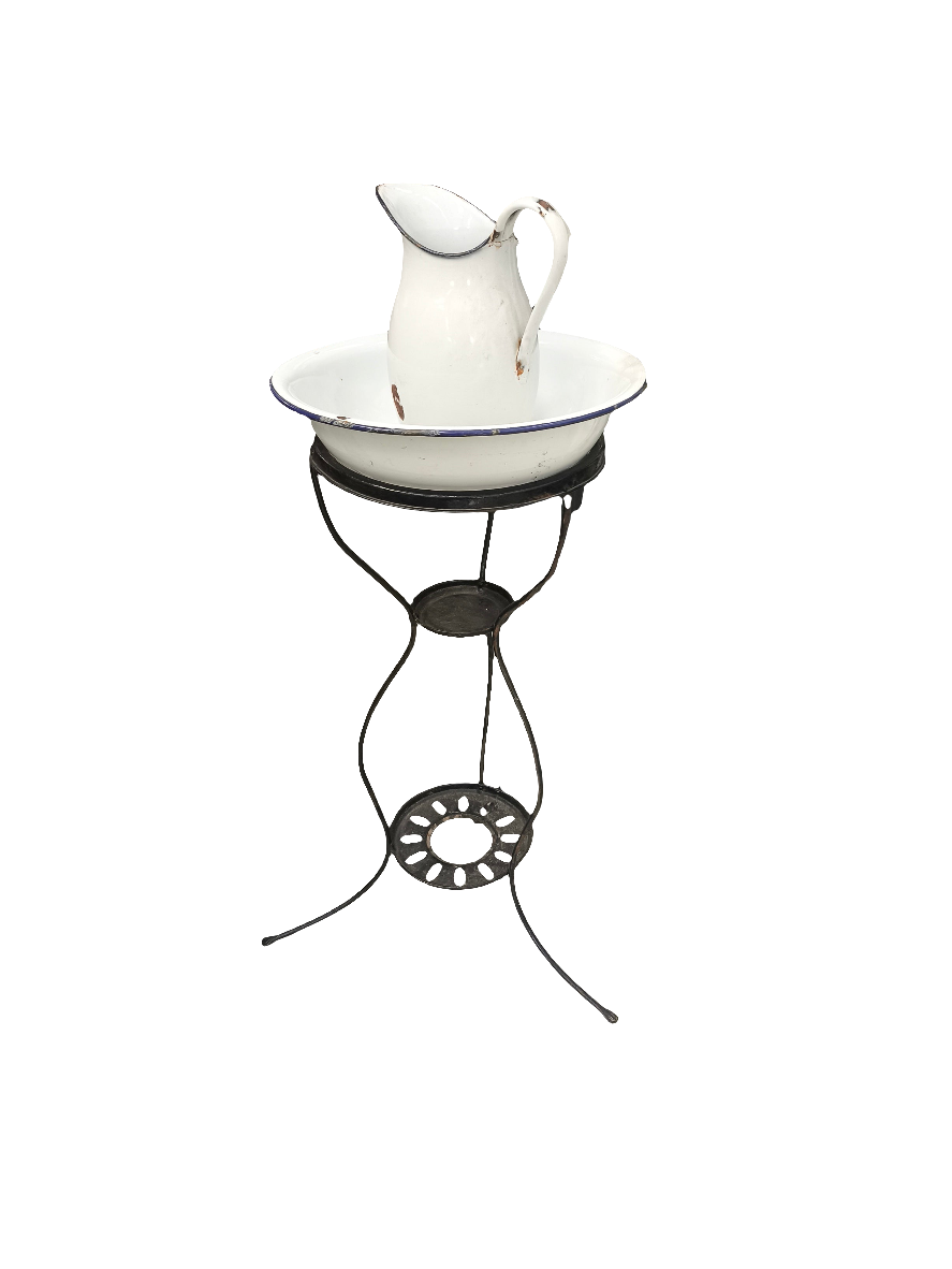 Antico Lavello Da Camera Struttura Ferro Con Catino & Brocca Ferro Smaltato